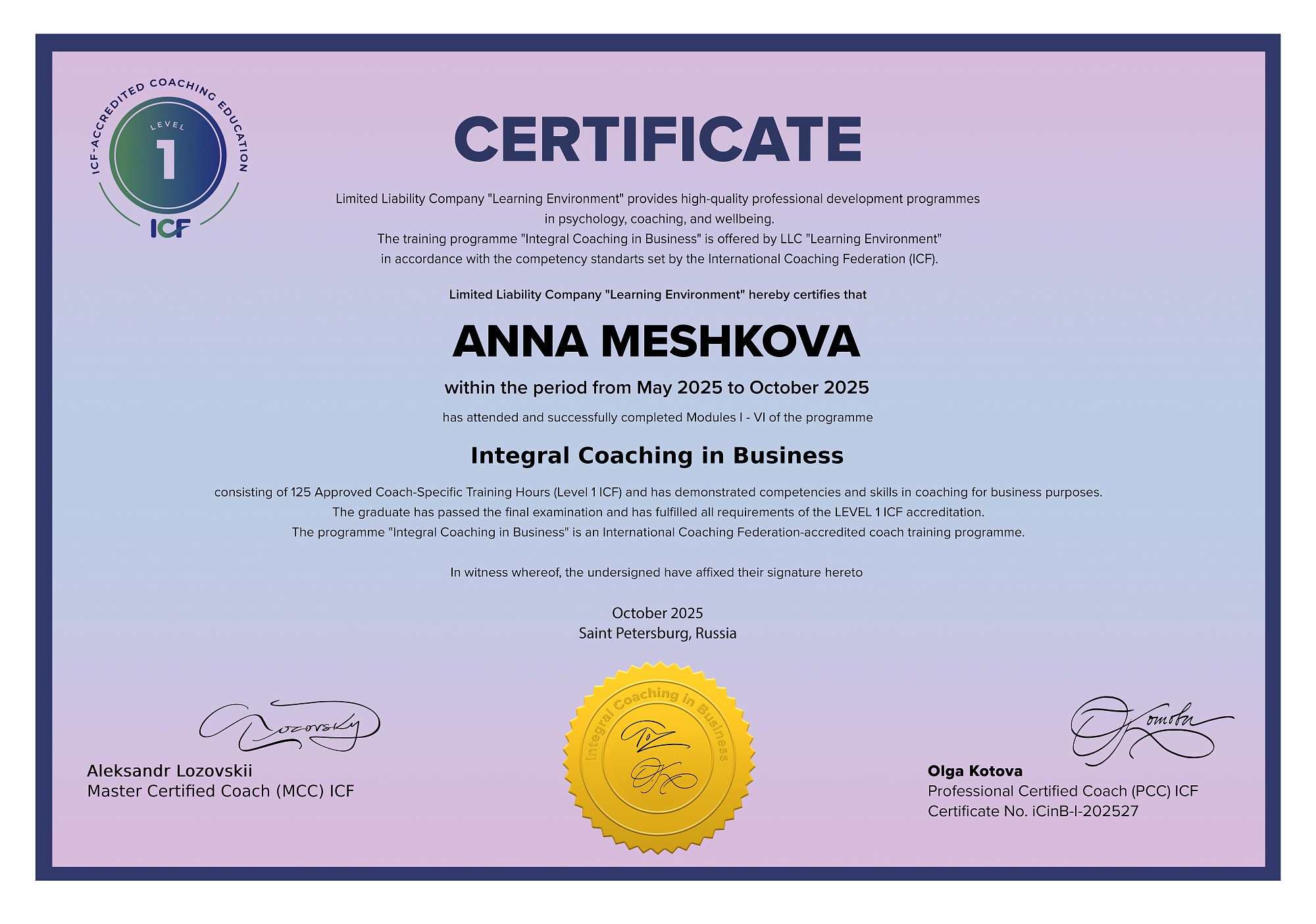Я сертифицированный коуч по стандартам ICF, имею 35+ часов практики в проведении индивидуальных коуч-сессий.