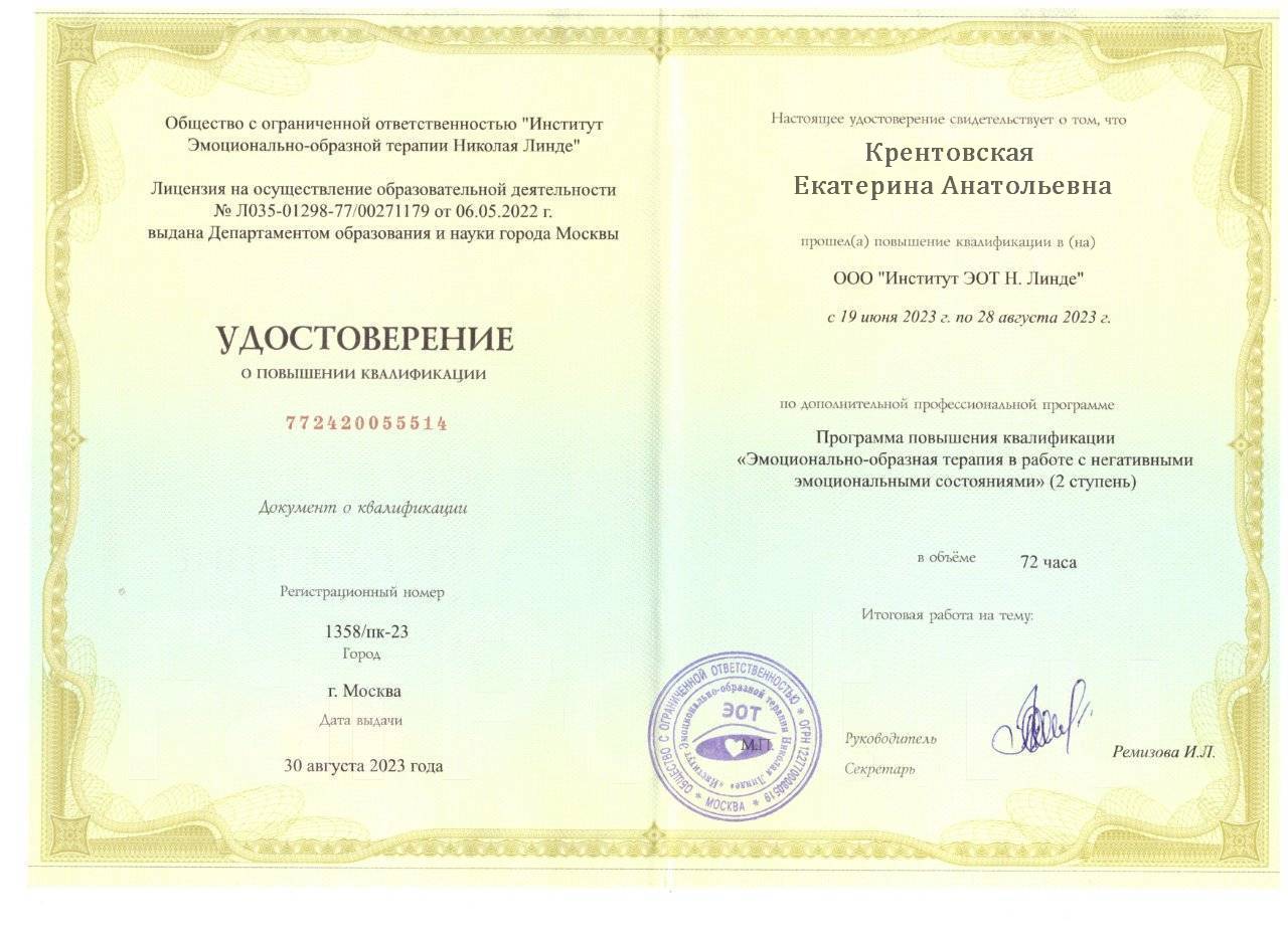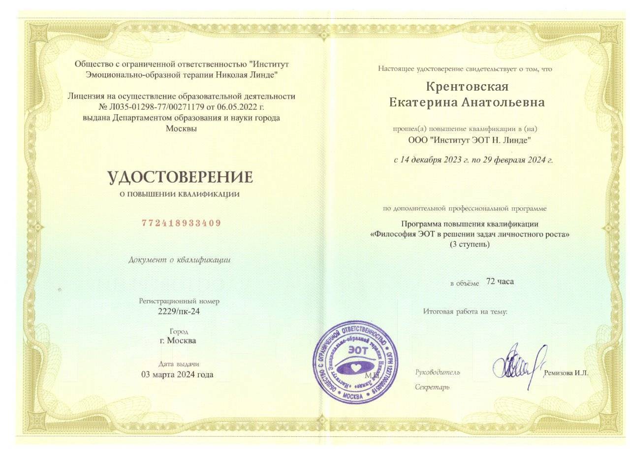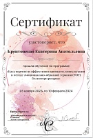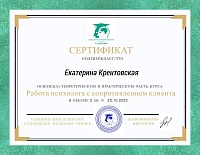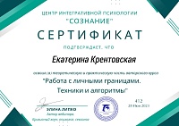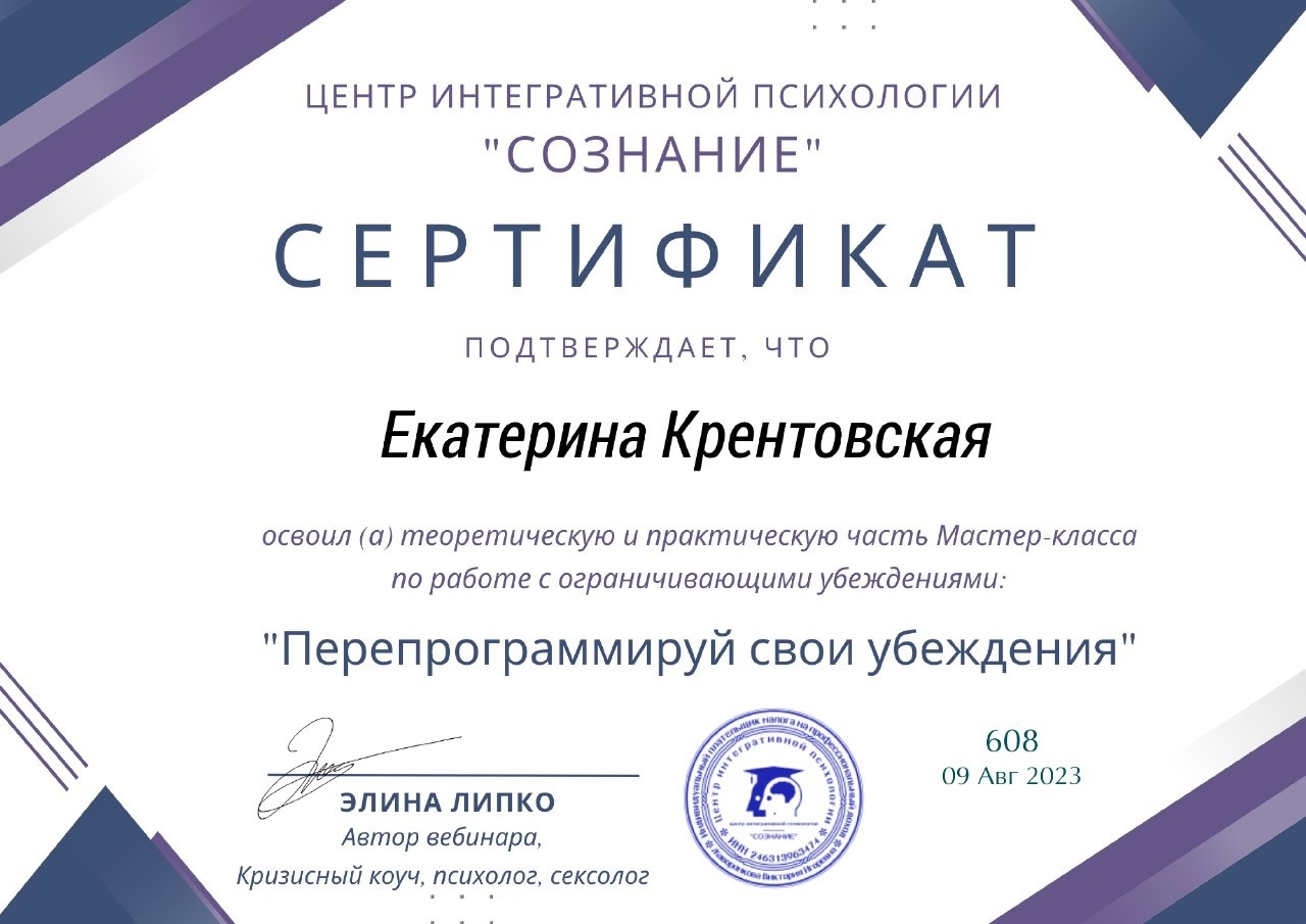 - Повышение квалификации: "Работа с убеждениями в КПТ", Центр интегративной психотерапии2023