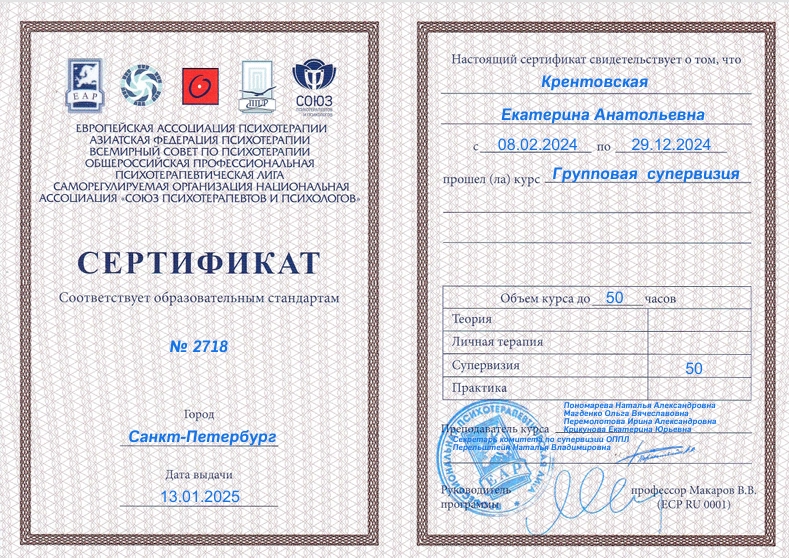 - 50+ часов Аккредитованных супервизии в Профессиональной Психотерапевтической Лиге2024