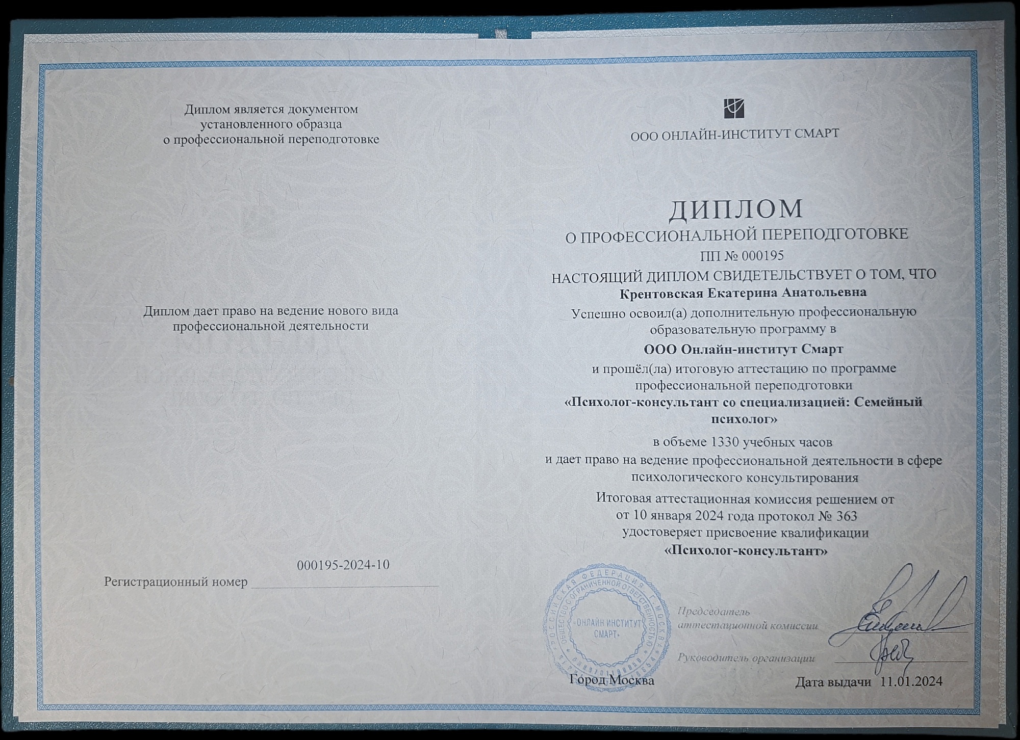 - Smart — международный онлайн-институт психологии, г. Москва, Квалификация "Психолог - консультант" со специализацией "Семейный психолог"2024