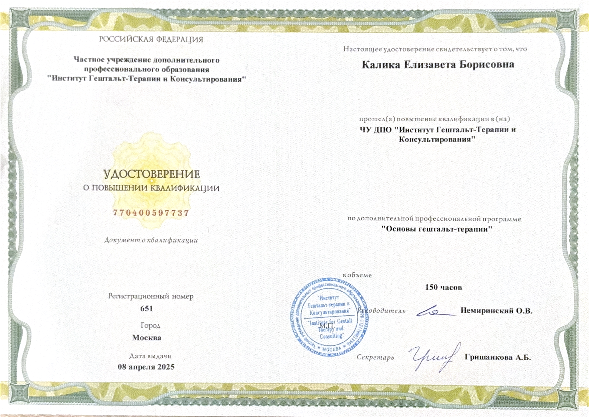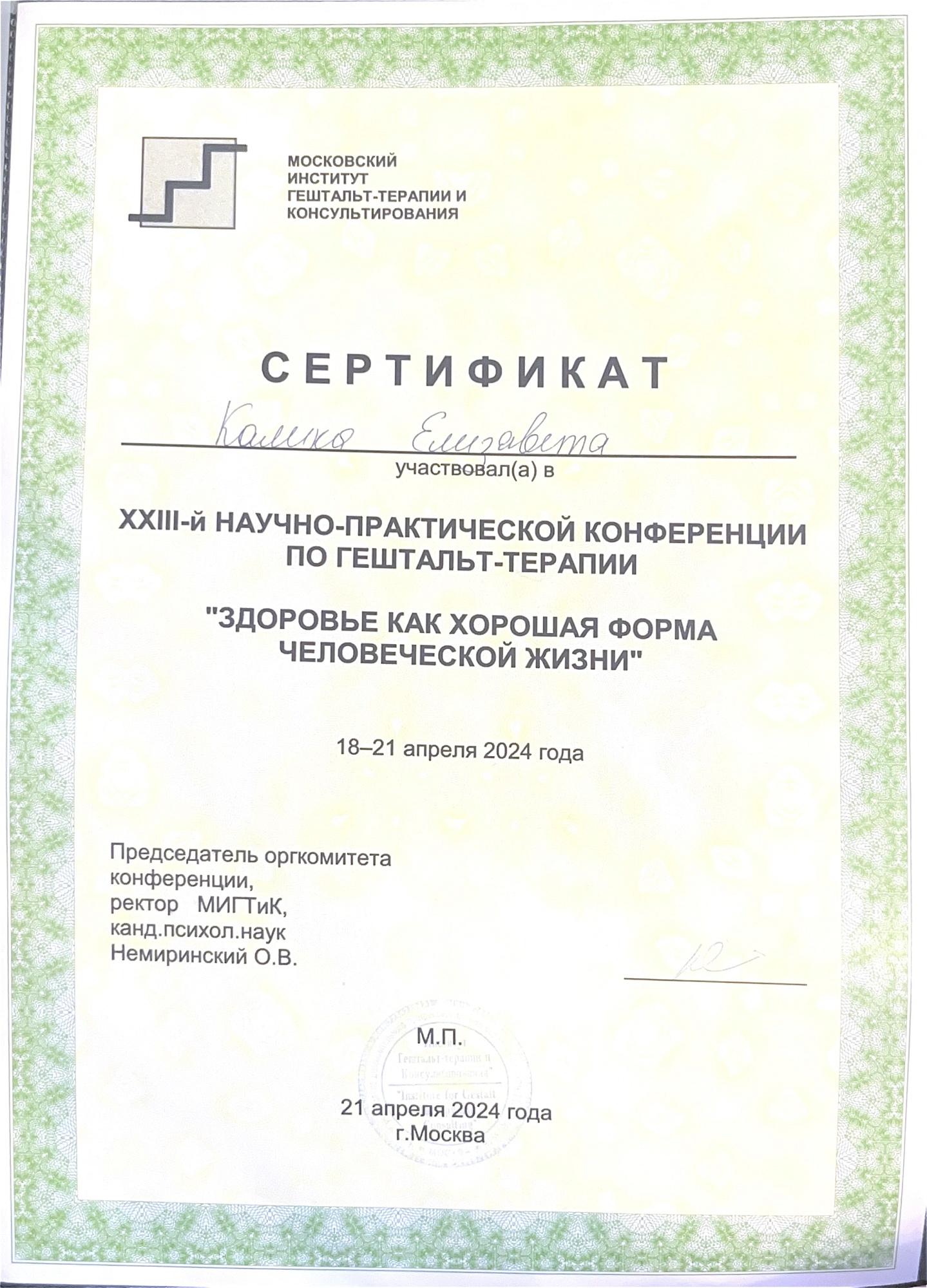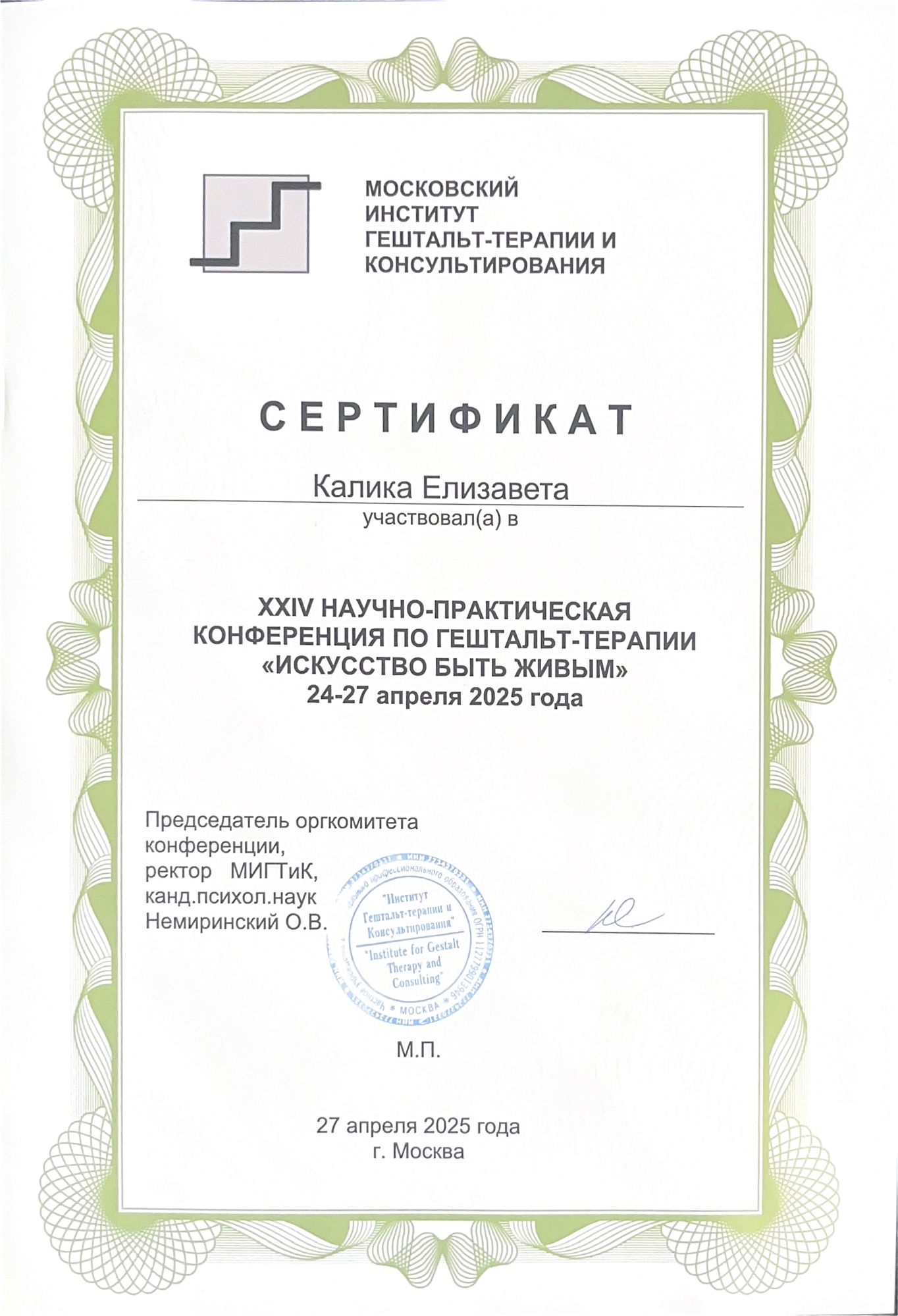 - Участие в Интенсивном семинаре по гештальт-терапии2024