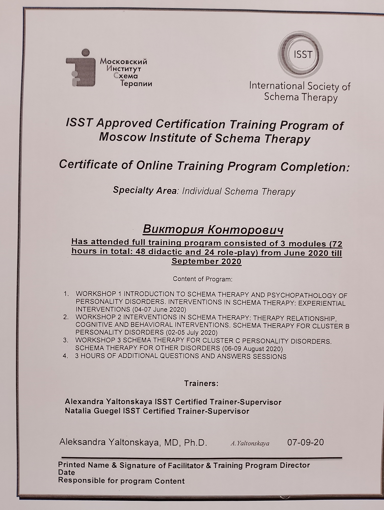 Опыт работы более 30 лет. Мои клиенты живут в разных странах, разных возрастов, социальных и культурных слоев, а также с различными потребностями. Я концентрируюсь на таких темах, как тревожные расстройства, панические атаки, ПТСР, депрессия, личностный рост, управление стрессом, одиночество, супружеские измены, сексуальные проблемы, проблемы в отношениях и другие эмоциональные трудности. Опыт работы психологом в психдиспансере, в клинике по лечению сексуальных нарушений и нарушений репродуктивной сферы, в клинике по лечению зависимостей, в спорте высших достижений, организационным психологом. Занималась специальной психологической подготовкой сотрудников МВД. Более 15 лет работы бизнес тренером. Провожу тренинги личностного роста, достижения целей, развития личной харизмы, профилактики выгорания, по работе с финансовыми ограничениями и блоками и пр..И еще один из моих профессиональных интересов - успешные люди. Как помочь справиться с внутренними и внешними ограничениями, победить самосаботаж и реверсирование. В каждом живет красивый, любимый и успешный человек. Освободить его и сделать сильнее - моя с клиентом задача.
